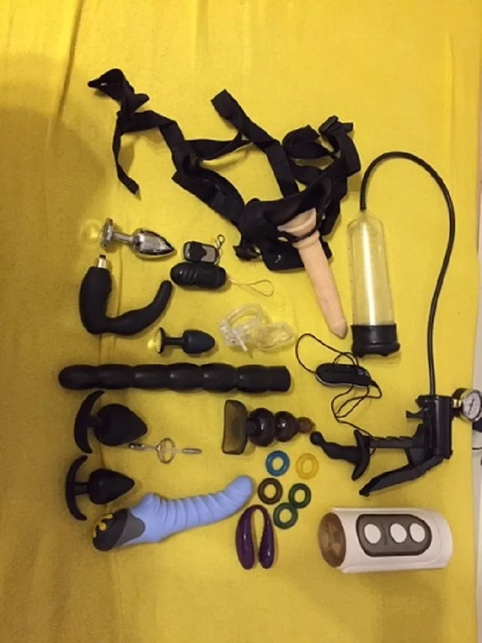 Wäscheklammern, Strap-On, Dildo, Analplug, Pumpen, Handschellen, Keuschheitsgürtel, Wachs, Öl/Gel clothespins, strap-on, dildo, anal plug, pumps, handcuffs, chastity belt, wax, oil/gel